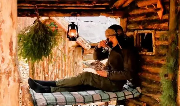 在一個視頻中,男主在原始森林裏,從挖掘基坑到裁切木頭,從安裝門窗、飯桌到做好防風、防潮,從無到有建造一棟木屋。