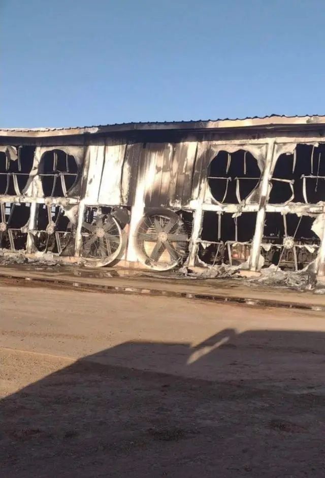 在這樣的連環爆炸、起火作用下,整片養殖場很快被大火覆蓋。現場的“蘑菇雲”總體上呈現灰黑色,説明這些其實主要是燃燒產生的煙霧。如果完全是甲烷爆炸產生的,那隻會產生白色的蘑菇雲。