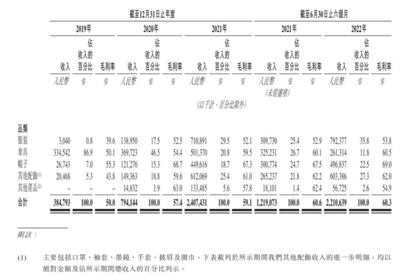 蕉下的營收也從傘具扛鼎變成了服裝、傘具和帽子共同支撐。招股書顯示,2021年,這三者分別佔營收的29.5%、20.8%和18.7%。