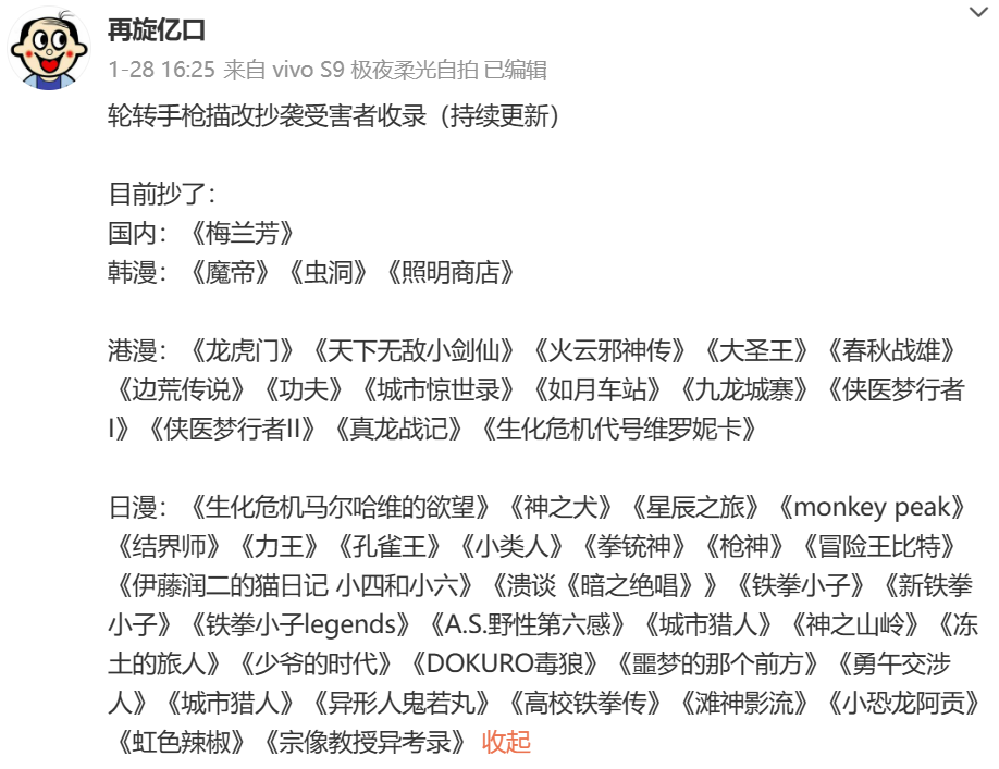 隨着對比圖在貼吧、微博等社交平台傳播,對比抄襲內容的帖子也成了“連載”,越來越多網友發現了轉輪手槍及其工作室“高產到嚇人”的秘密。