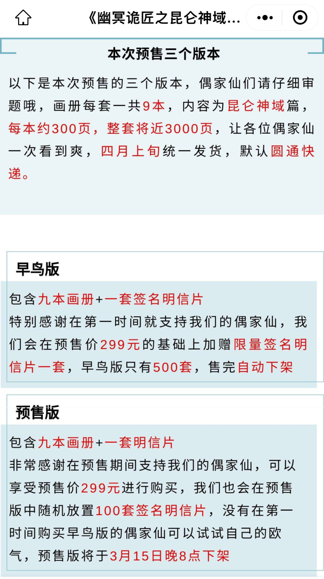 小程序售賣實體畫冊已經是木偶漫畫的常規操作。《詭案實錄》特別篇《詭案特九組》,曾以實體書形式發佈,目標羣體直指粉絲。而《幽冥詭匠》實體畫冊已經出到第三部,以最近的《幽冥詭匠之崑崙神域》為例,整部包含九本內容,限量的早鳥檔、限時的預售檔價格均為299元,贈品有所差別,普通價格349元,二手交易平台套裝則能漲到400元以上。一些讀者直到在抄襲風波之後回想起來,才意識到自己買的實體書 “沒有出版社和條形碼”,並非公開出版流程出版的正規書籍。