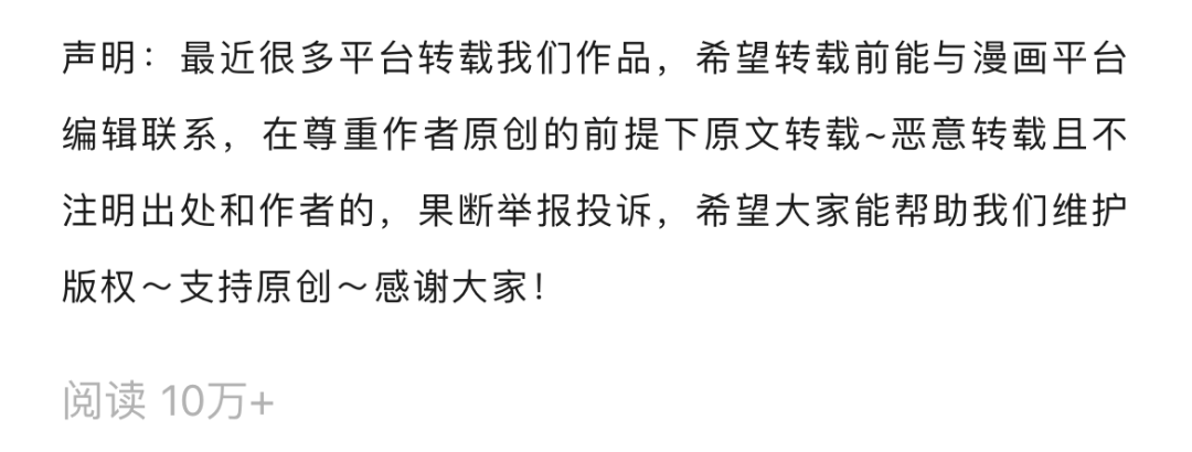 聊到這裏,ACGx不禁想起漫畫從業者與愛好者常討論的“建立內容生態”相關話題,都説用户付費習慣培養不易,原創內容處境艱難。原創作為漫畫市場不可或缺的一部分,原本是漫畫家發自初心的選擇,也是讀者尋找精神共鳴的窗口,在商業回報上卻始終面臨壓力,因此愛好者面對帶有“原創”標籤的內容,總希望給予更多關懷和寬容。木偶漫畫大概也懂得這份羈絆,公眾號發佈的每一話《幽冥詭匠》內容裏,都會添加一段“原創聲明”,現在想想,這可真是一段讓人啞口無言的諷刺笑話啊!