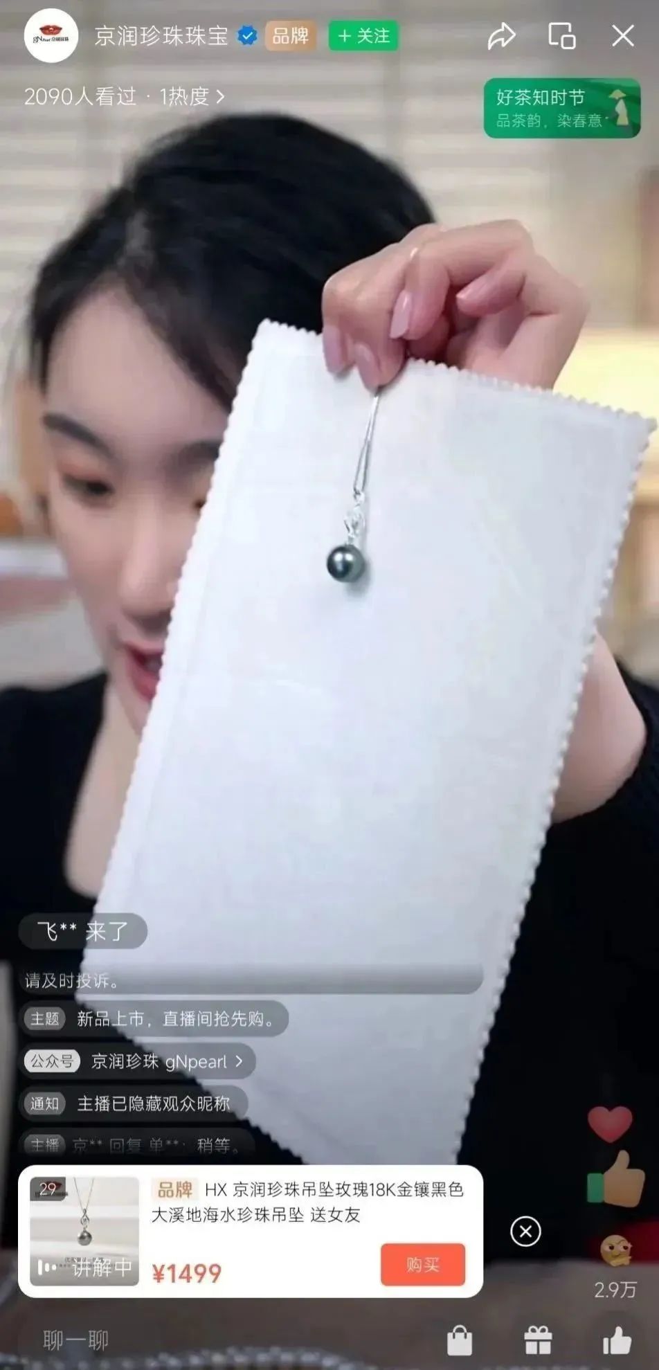 劉倩表示,珠寶是一個特殊的品類,主播得讓用户看到首飾戴上身的整體效果。這對直播間的燈光和畫面要求也很高——一定要調得更加精緻,得把珍珠的光澤感顯現出來,讓人一看到主播的穿戴效果就覺得高級、想買。