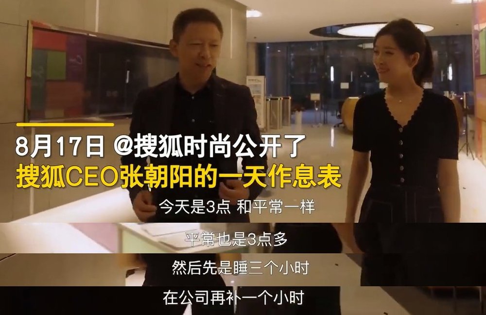 在視頻中,當主持人談到關於睡眠問題的時候,張朝陽説自己是睡3個小時,3點多就起牀了,到公司工作一會兒,然後補一覺。