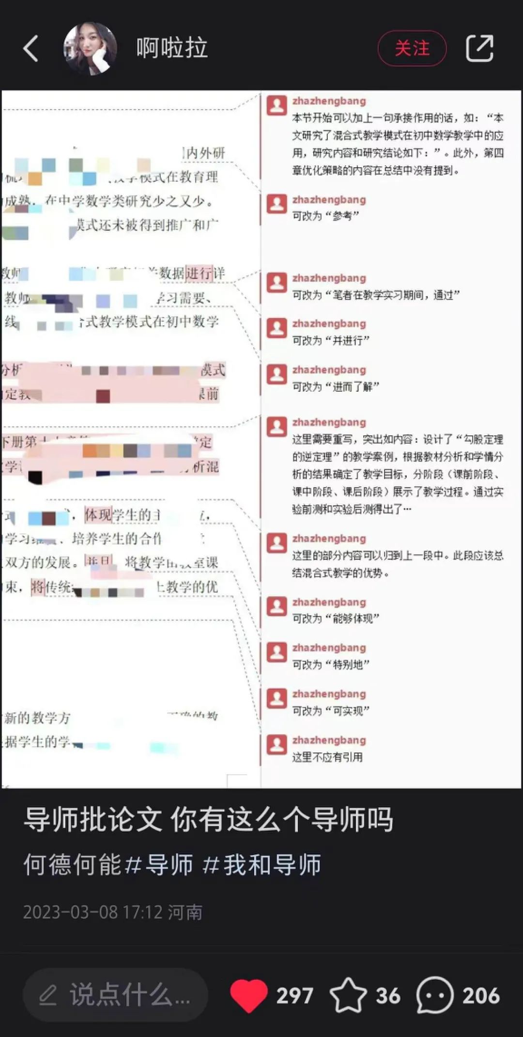 有時候,被稱作神仙的導師會把修改意見一一排列在修改區,具體到方法論,讓學生十分感動。