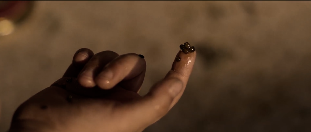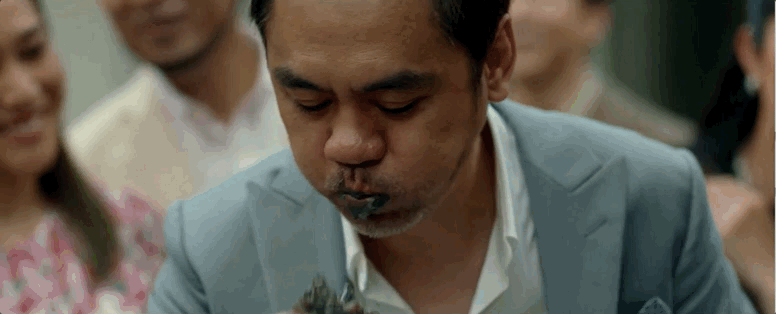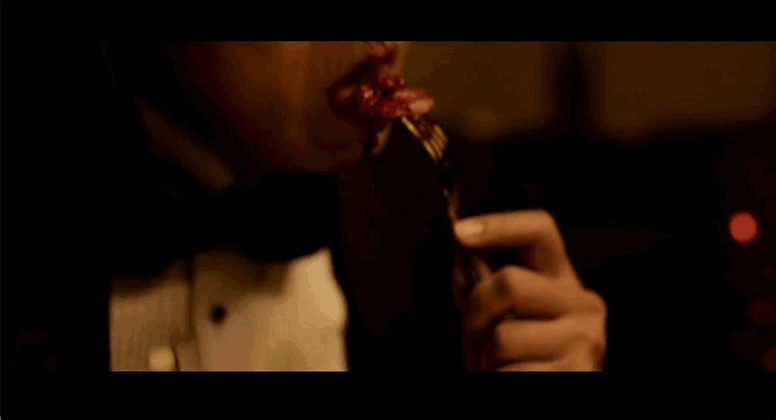 醬汁四溢的畫面,配上嘴部的特寫,以及滲人的音樂,詭異的慢鏡頭。