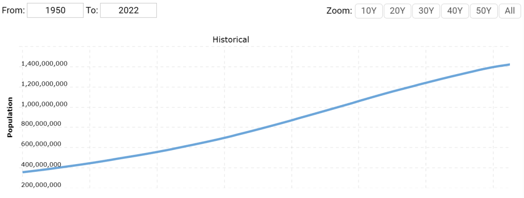 與普遍低生育率、甚至陷入人口負增長的東亞、西歐國家相比,印度在過去的20年中,人口保持着穩定增長,而拉長時間座標,從二戰後世界經濟復甦的1950年代開始,印度的人口同樣維持了穩定的線性增長。