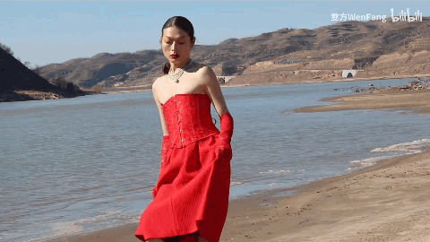 陽光明媚的天氣,他穿着一襲紅裙在河邊舞動,陽光在他紅色的小裙子上跳躍: