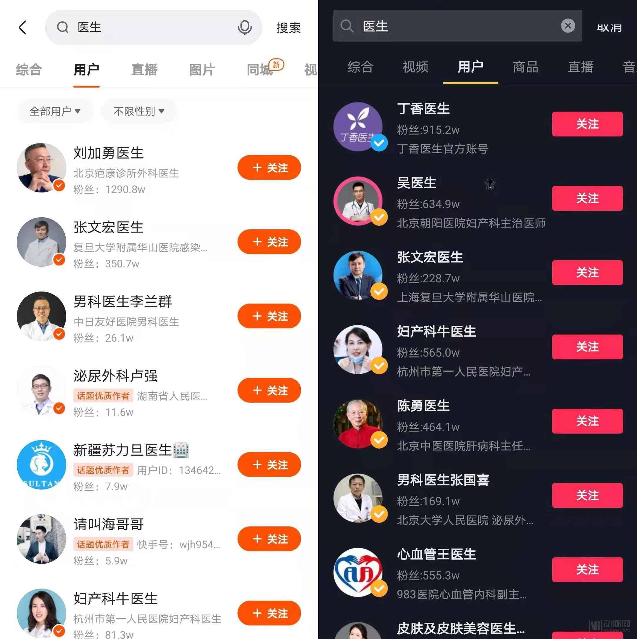 ▲在短視頻平台上搜“醫生”出來的用户。左為快手,右為抖音。