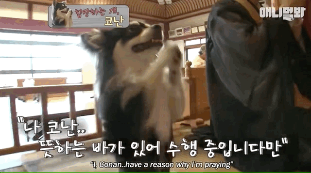 每當廟裏的和尚誦經唸佛,小狗就蹲腿直立,雙手合十拜佛。