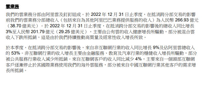 從財報來看,阿里雲目前依然嚴重依賴互聯網企業。2022年Q4,抵消跨分部交易的影響後,阿里雲來自互聯網行業的收入同比下跌4%,佔阿里雲總收入 的47%,對比上年,下降1% pct。