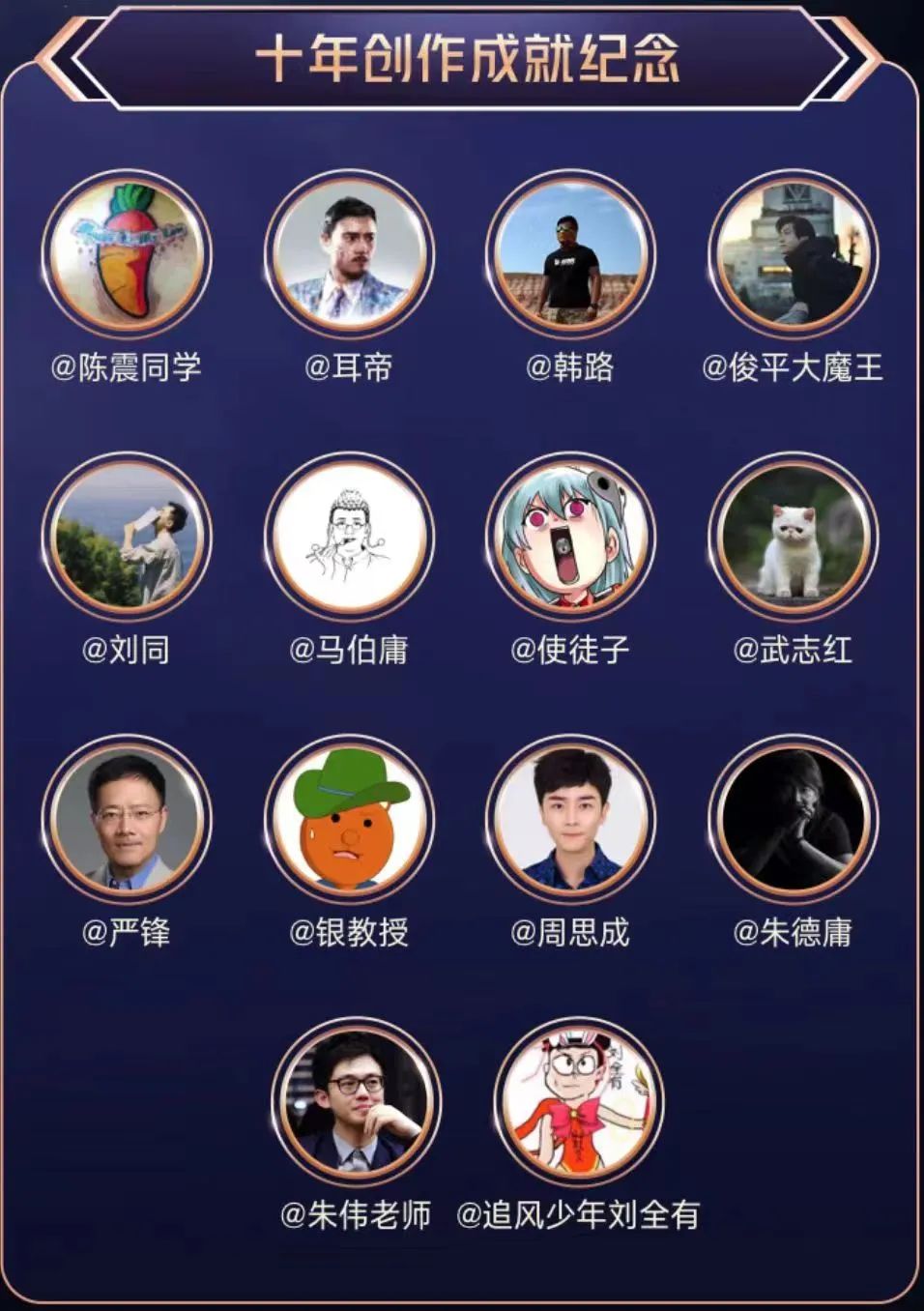 在這份由14人組成的榜單中,我們能夠看到許多熟悉的名字:@劉同 、@使徒子 、@銀教授 、@馬伯庸 …..他們是微博內容創作者羣體的中流砥柱,更是微博十餘年發展的見證人。