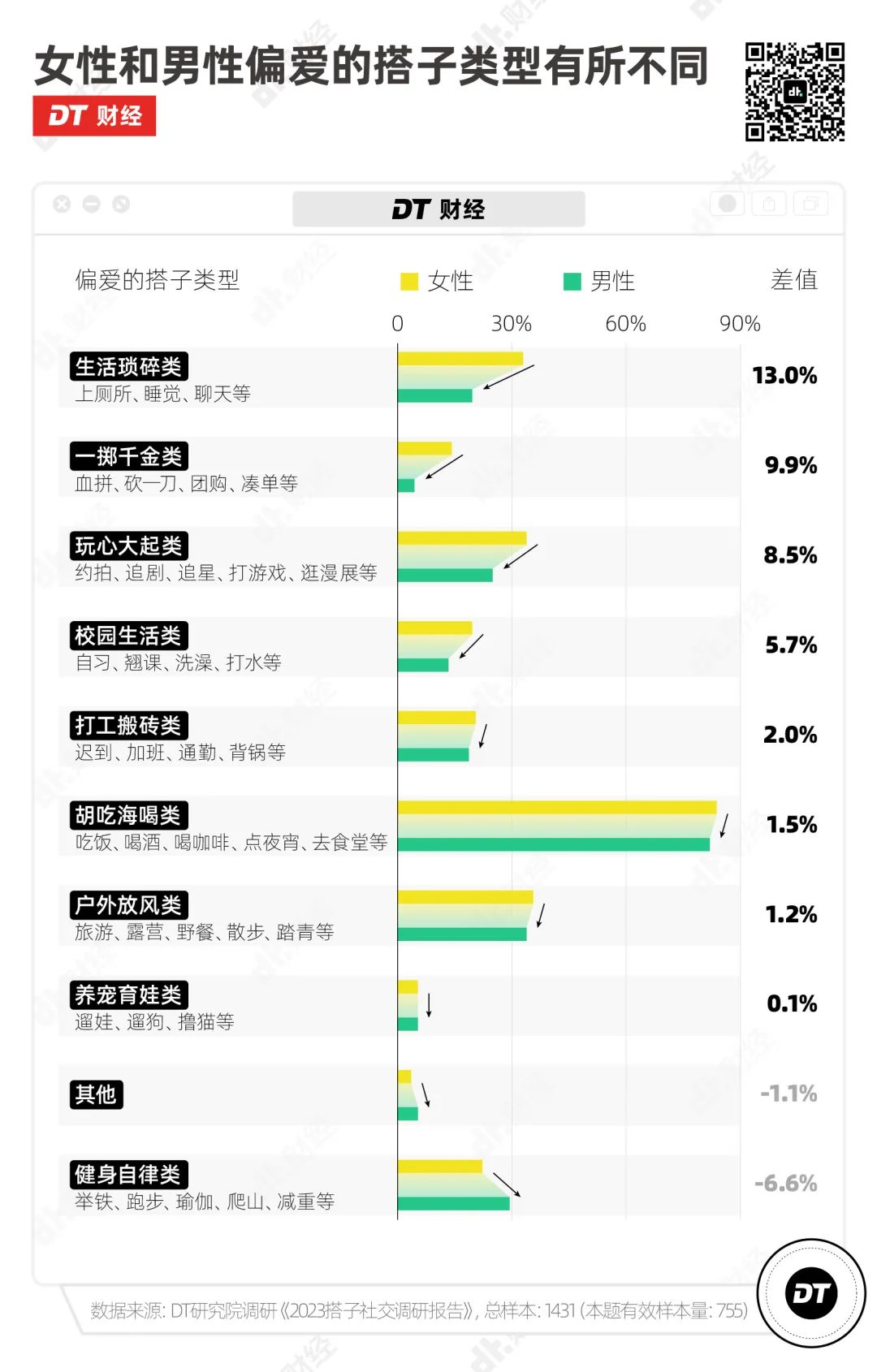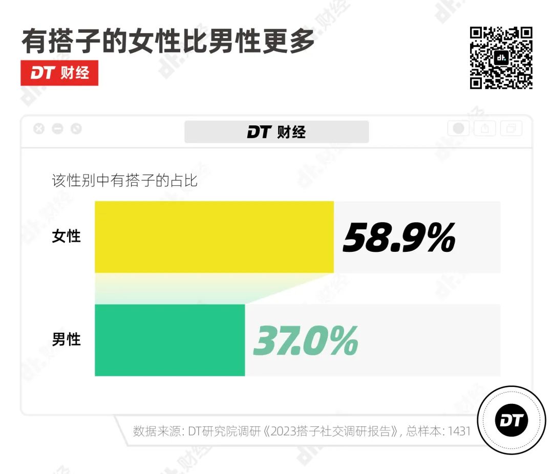 DT研究院數據顯示,搭子型社交在女性中更為流行:近六成女性有至少一個搭子,但有搭子的男性不到四成。
