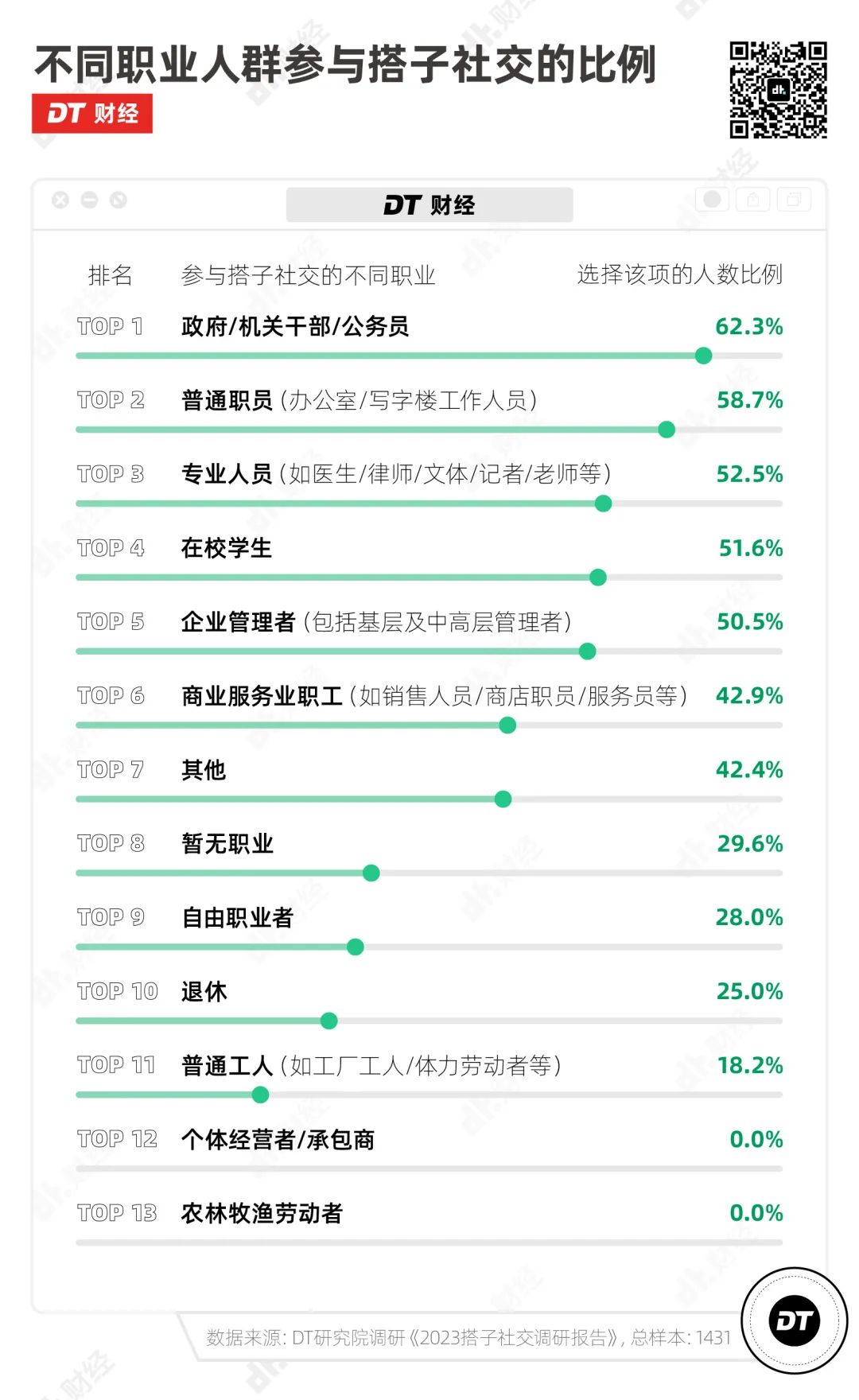 在各個職業中,公務員參與搭子社交的比例最高,超過六成的公務員都擁有至少一個搭子。與之相比,參與搭子社交的自由職業者的比例要小得多,只佔自由職業者總數的28%。