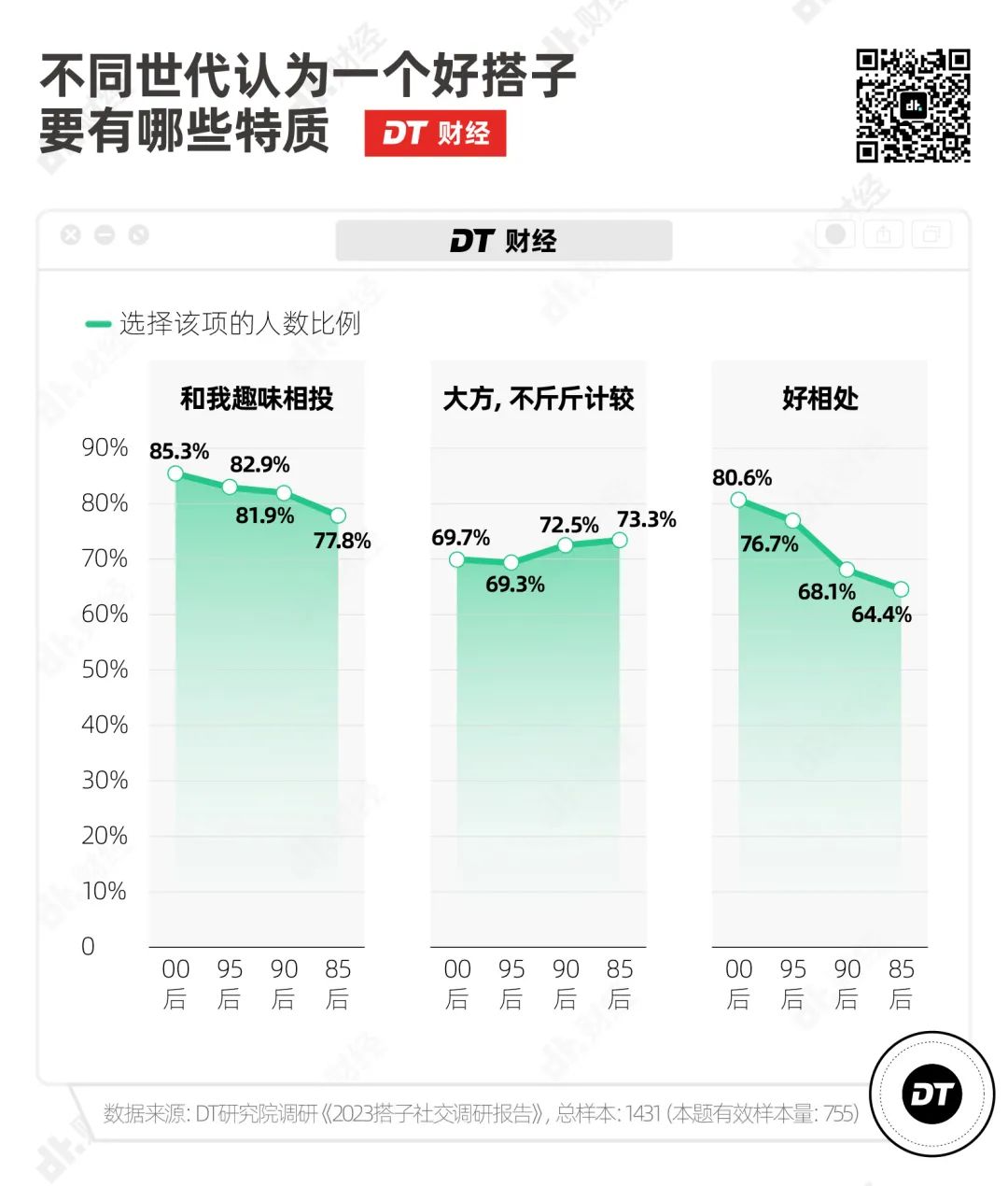 在這一點上,00後尤佔鰲頭:認為“和我趣味相投”和“好相處”是理想搭子特質的00後比例最高,隨着年紀增長,認為這兩項重要的比例也在各個世代中逐漸減少。但同時,00後對“大方,不斤斤計較”這個搭子特質的感知卻相對更不敏感一些。