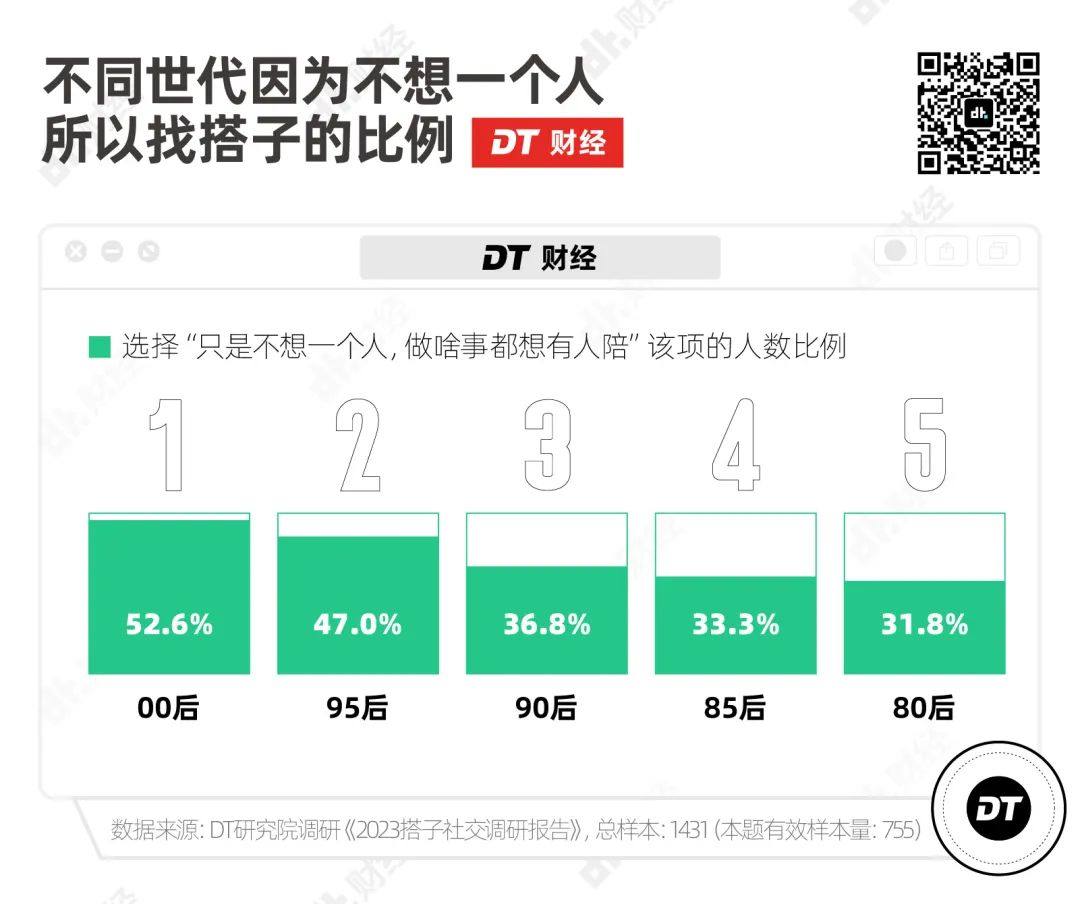 且年紀越長,獨立性也越強:在00後中,一半以上的人找搭子是單純地因為不想一個人,但這個比例隨着年齡遞減,在80後中只佔了大約三成。