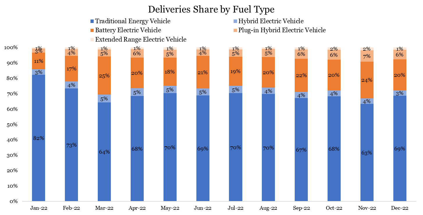 從價格區間來看,整個汽車板塊中,10萬-30萬價格區間持續擠佔0-10萬的份額。30萬-40萬的份額在第四季度略降,而40萬以上的份額一直保持穩定。2022年初,新能源汽車10萬-20萬價格區間的佔比低於其在整個汽車行業的佔比,但這一佔比在2022年逐漸上升,主要得益於比亞迪的崛起。30萬以上的新能源汽車有更多未開發的機會,因為該價格區間在新能源汽車中的份額低於其在整個汽車行業的份額。