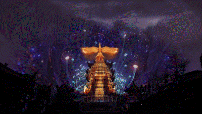 **其次,元素雷同,意象堆疊。**拍攝對象的高度重複也直接導致了燈光秀創意元素的雷同。圍繞着高聳的建築主體,不同的燈光秀中,蛟龍反反覆覆地盤旋而上,鳳凰一次又一次地浴火重生,巨鯨不厭其煩地躍出海面。燈光秀中的意象只是計劃性的到點出場,到點消失,沒有敍事的動因和情節的遞進,唯一需要的只是他們存在過。