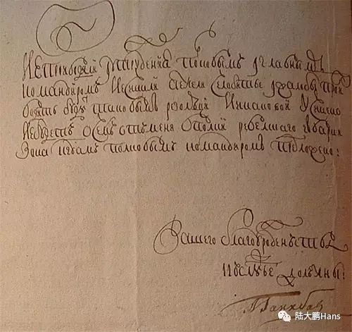 阿布拉姆•漢尼拔於1744年3月22日簽署的信件。現存於塔林市檔案館