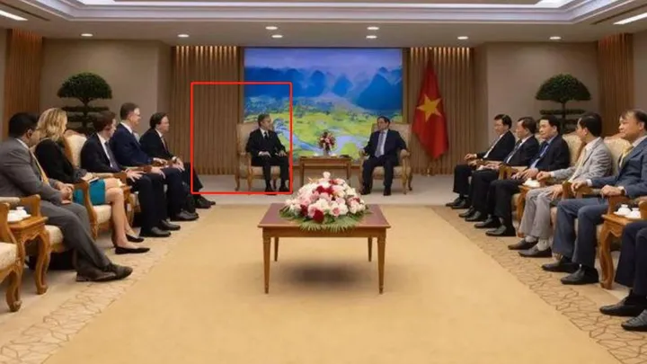 看看這張圖片,布林肯坐的地方沒有美國國旗,而右邊越南當局官員坐的地方有越南的國旗。這個很不符合常理。