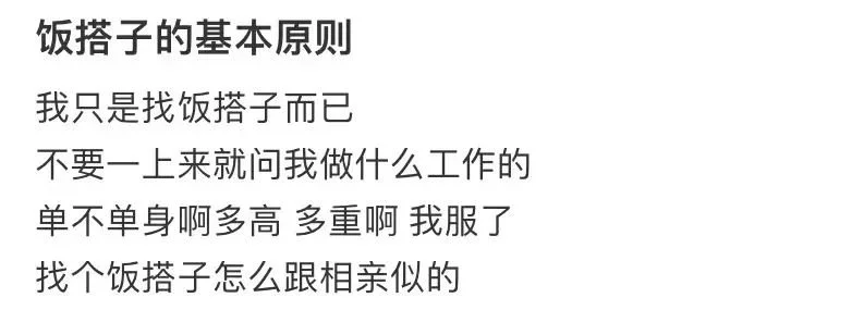 找不到對象的薄荷,覺得找個飯搭子週末出去走走也不錯。他驚喜地發現,同樣的條件在相親界無人搭理,但飯搭子界卻格外寬鬆——沒人在乎他互聯網大廠的title,“成為飯搭子只需要你有張嘴,能A錢。”