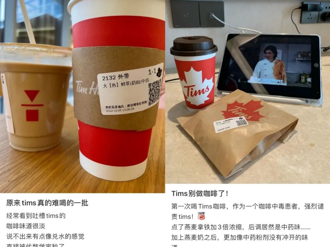 在小紅書和微博等社交媒體平台,“小紅杯”的討論熱度遠不及“小藍杯”瑞幸和“小綠杯”星巴克,比如小紅書上相關筆記,瑞幸和星巴克均在百萬篇左右,而關於Tims咖啡的評價,則更多是“不好喝”,其中不乏網友表示“為了點他們家貝果才點了咖啡,結果難喝暈了”、“這輩子沒有喝過這麼難喝的咖啡”、“Tims別做咖啡了,以後就考慮開貝果店吧”、“貝果你可以永遠相信Tims家的,他家的咖啡就不要去踩雷了”……
