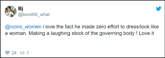 “我最喜歡的一點是,他根本沒有想要打扮成女人的意思,這更讓那些管理機構成為笑柄,大愛!”