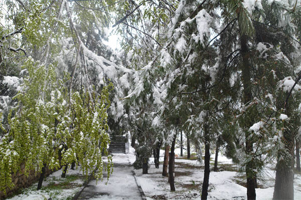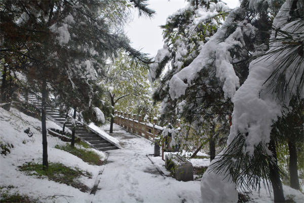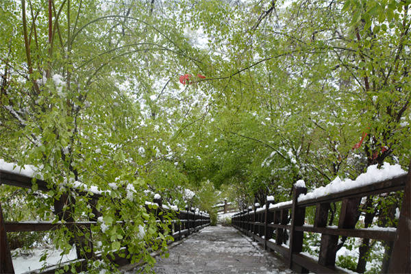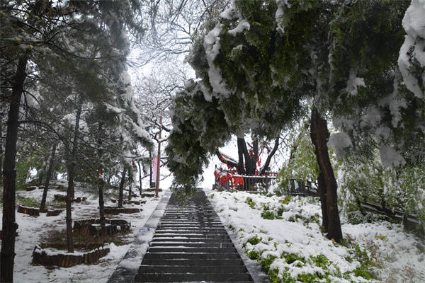 4月21日晚,太原市淅淅瀝瀝下了一天的春雨變成飄飄灑灑的飛雪!四月的降雪帶給人們驚喜,也帶來了冷空氣。從短袖到棉衣,彷彿又回到冬天!一場春雪蹁躚而至,花枝被冰雪壓彎了枝頭伴隨着簌簌聲,冰雪自樹上掉落、融化悄無聲息地滋潤着蒙山。