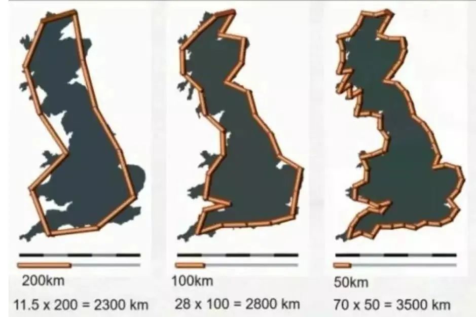 而用小尺度測量,得到的結果會大得多。用的尺度越小,得到的值將越大。