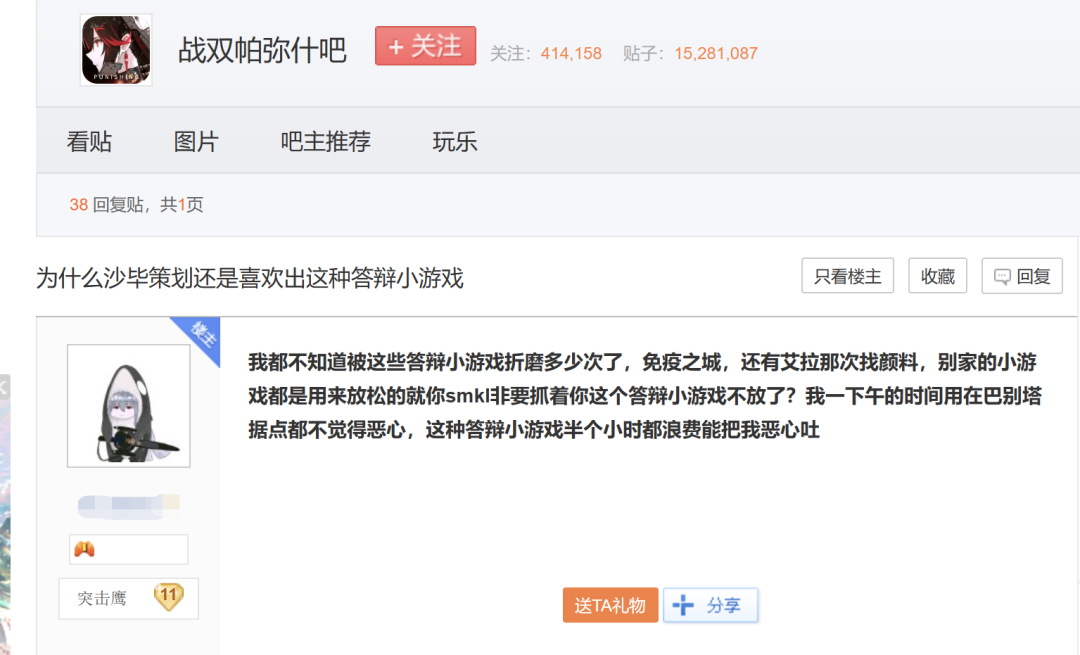 雖然《戰雙帕彌什》戰鬥表現上足夠亮眼,但遊戲在關卡設計、版本小遊戲、運營方式等內容存在着較大的瑕疵。例如:關卡中時不時出現的反人類的鏡頭、交互設計;被各路玩家吐槽的版本小遊戲;以及庫洛放飛自我的運營方式等。