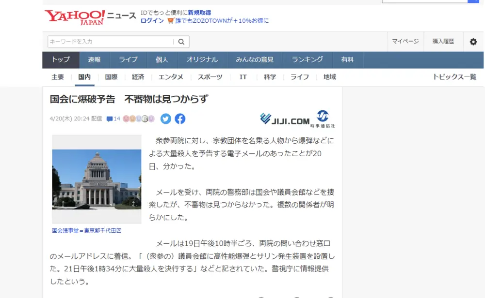 比如,曾經被視為世界最安全國家的日本,在安倍遇刺、岸田遇襲後,2023年4月19日,日本國會又收到了自稱是宗教團體成員的恐襲預告,預告聲稱他將在21號用沙林毒氣和炸彈對國會進行襲擊,並強調“只有恐怖襲擊才能改變日本”。