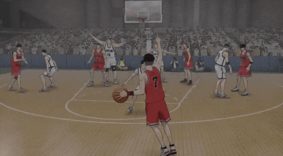 流川帶球衝向前場,傳球給早已擺好姿勢的櫻木,打出平平無奇的跳投……
