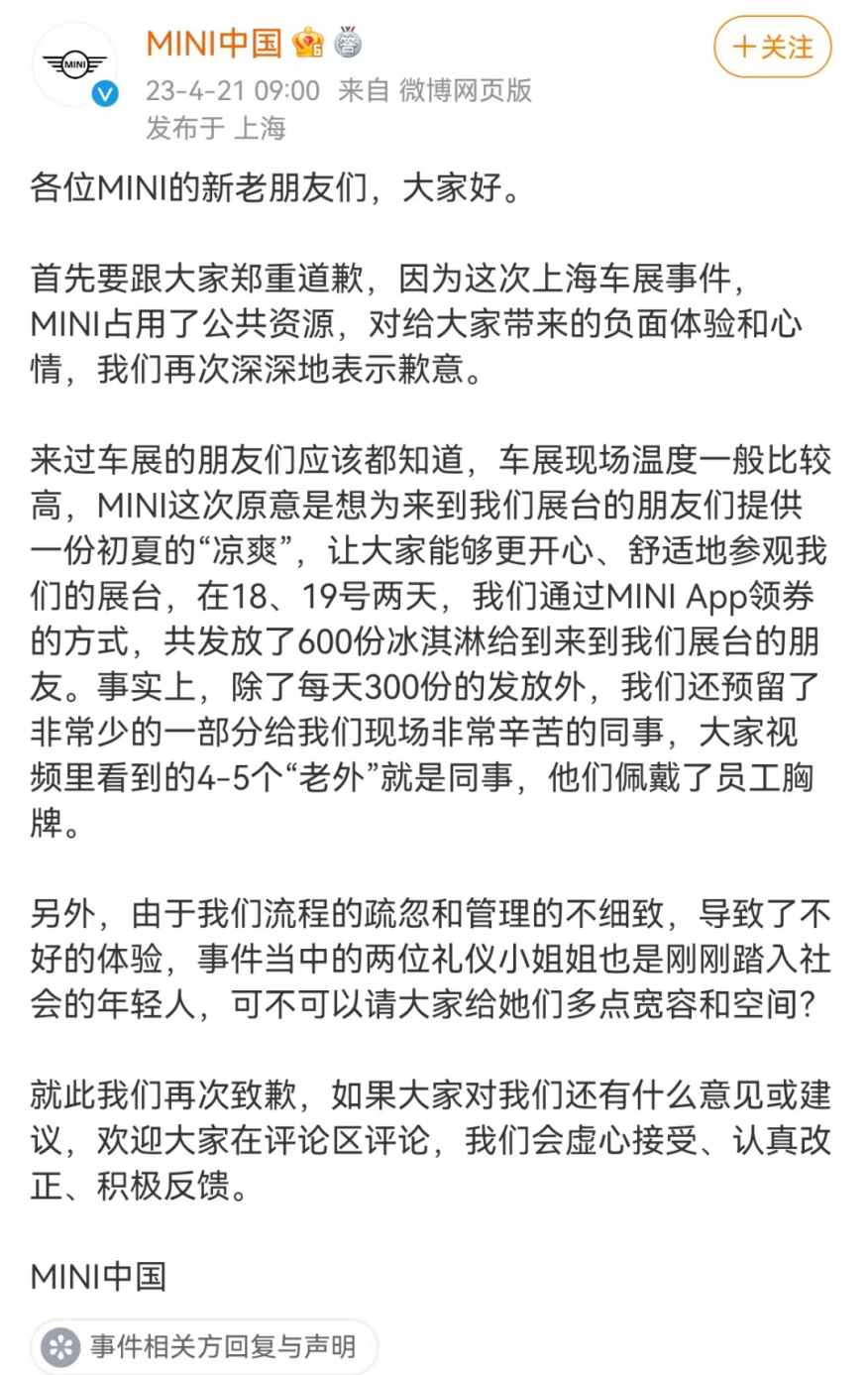 4月20日,寶馬MINI中國官微發了一條極其簡短的道歉文,檢討“內部管理不細緻和工作人員失職”。