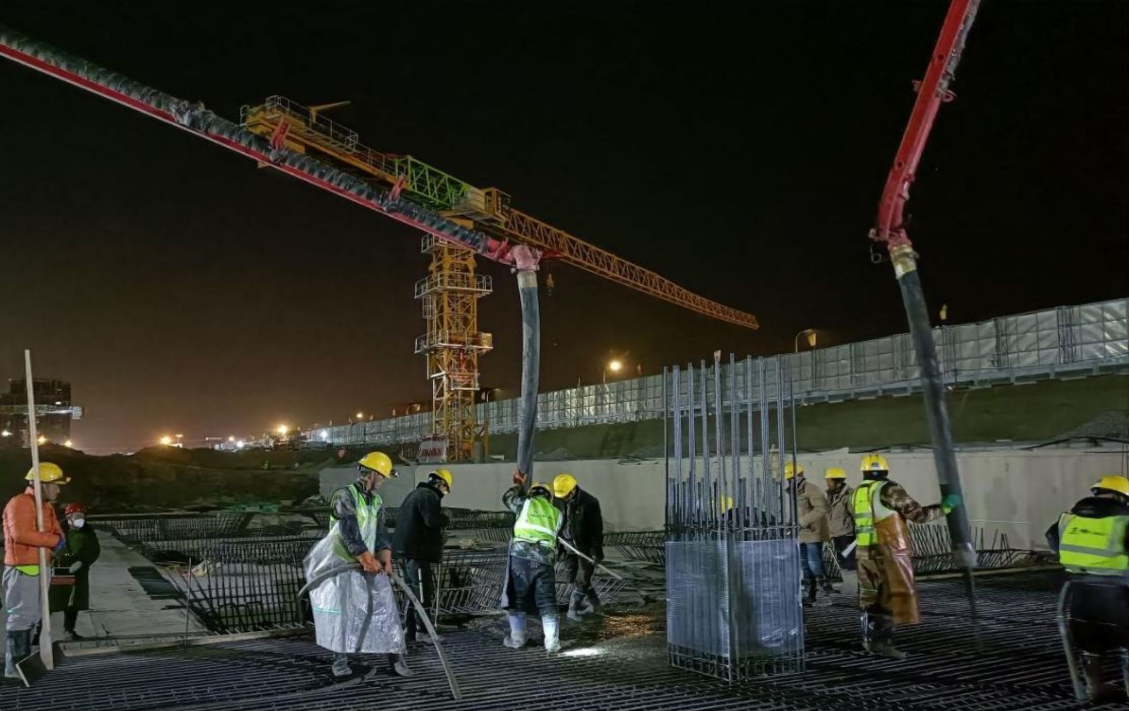 本次澆築部位為影視研學基地地下室底板,澆築量1890立方,區域內底板厚度500mm,從4月22日晚起,4台混凝土泵車連續澆築近10小時。此次底板的順利澆築,吹響了主體結構大幹快上的衝鋒號,在後續工程中,項目管理團隊將繼續攻堅克難,凝心聚力鑄就精品,樹央企形象、揚寶冶品牌,確保後續節點目標順利完成,以實際行動實現完美履約。