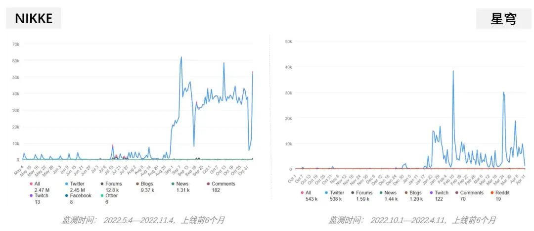 1)與《NIKKE》同期(上線前半年累計社媒聲量)對比來看,《崩壞:星穹鐵道》在日本的聲量相對低,可能與官方沒有大規模宣發有關。