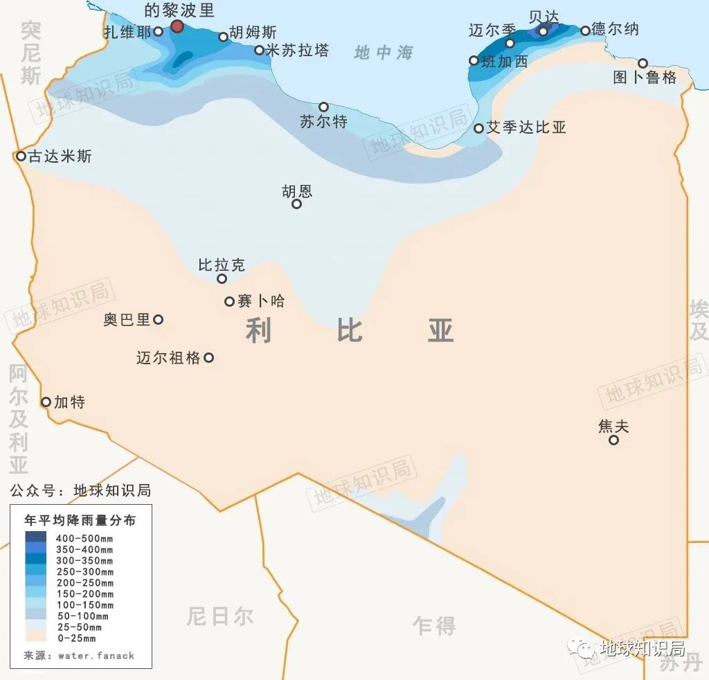 利比亞位於地中海南岸的北非,國土面積約176萬平方公里,排名世界第16位。雖然面積相當於52個海南島,也擁有狹長的海岸線,但是90%以上的國土都被沙漠和半沙漠覆蓋,既沒有常年河流,天然湖泊也很少,地表水資源十分有限。