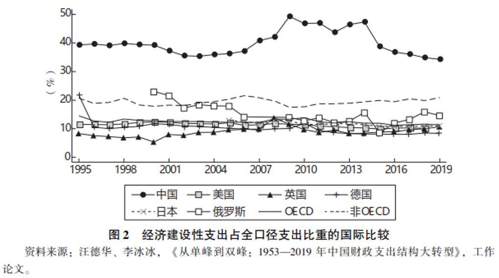 如圖1所示,我國的全口徑財政支出佔GDP的比重,在歷史上波動較大。在計劃經濟時期整體處於較高水平,部分年份異常增高,主要體現為積累性支出比重過高,實際上導致經濟效率不高。改革開放以來整體屬於V形。初期整體處於較高位置,隨後不斷下降,到1995年處於最低點。其後呈不斷上升趨勢,特別是2009年全球金融危機之後,全口徑支出規模大幅上升至35%左右,與改革開放之初較為接近;2011年之後又持續攀升,到2019年達到38%的歷史高位,僅次於“大躍進”時期。