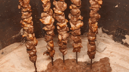 經過醃製的羊肉掛在饢坑中,由於不和明火接觸,饢坑肉完全是在饢坑裏燜熟的,這使得羊肉中的油脂和水分盡數保留,鮮嫩爆汁,更具有羊肉本真的鮮美。