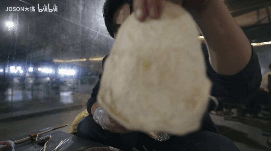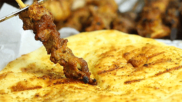 往饢上撒孜然和辣子面,再趁着熱乎勁把它對摺兩半,幾串油滋滋的烤肉一捋,羊肉的精華都收入“饢”中。