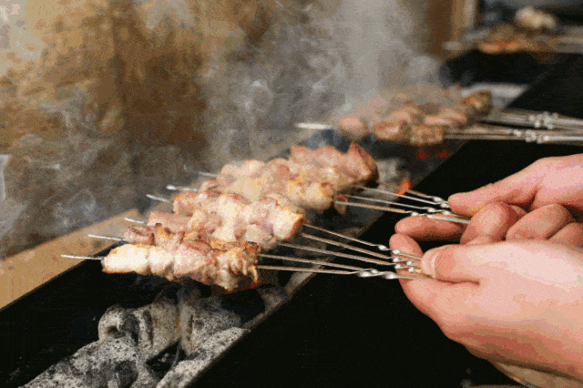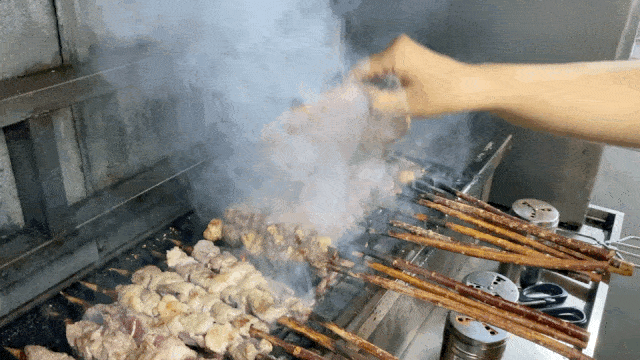 肥瘦相間的肉串經過師傅熟練的雙手,翻滾在燒烤爐子上,一經炭火的洗煉,香氣肆意飄繞,孜然和辣子面在接近烤肉的地方一同綻放。