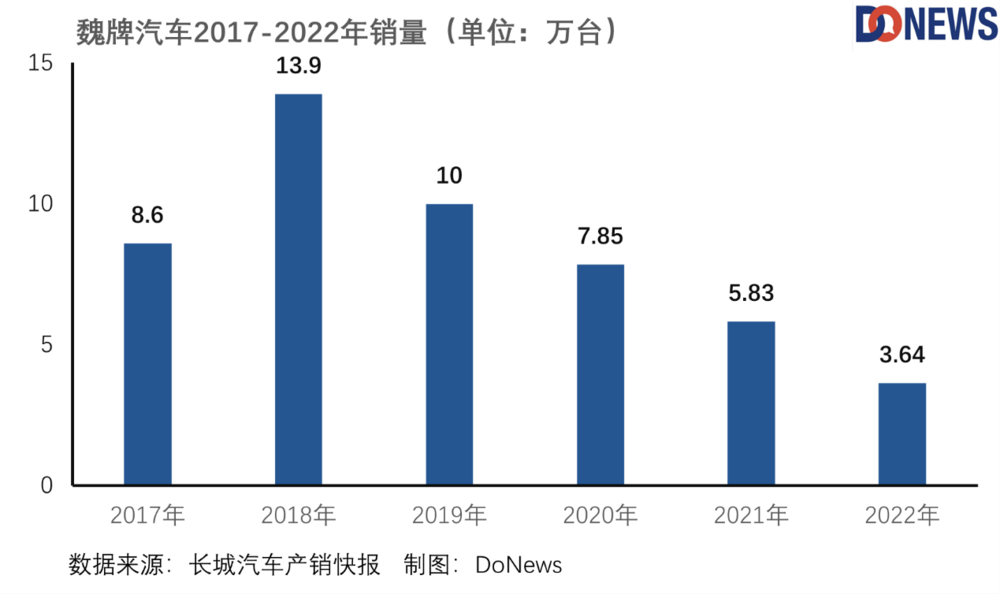 實際上長城銷量的下滑不只限於價格戰和沒有跟上新能源的步伐,還有一部分是源於對於自身定位的不清晰。曾經WEY也打破過合資品牌在15-20萬SUV的界限,它確實是風光過的,但在競爭對手的圍剿以及自有品牌相互擠壓市場的情況下,魏牌銷量逐年降低,甚至2022年僅售出36381台。過於沉溺高端化,也是長城汽車沒有趕上新能源爆發紅利的原因之一。