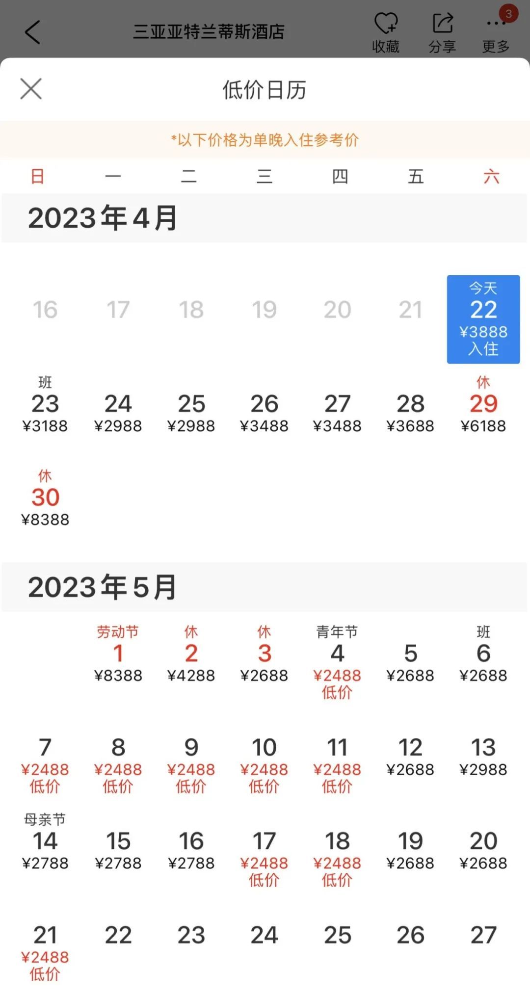 三亞亞特蘭蒂斯酒店4月、5月平日最低房價為2488元/晚,目前4月29日能夠入住的最低房價為6188元/晚,4月30日和5月1日的最低入住價格達8388元/晚。