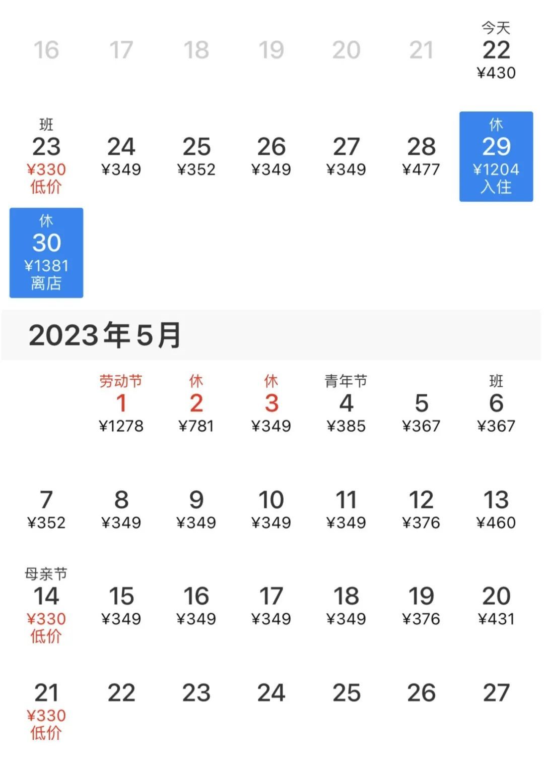 以蘇州觀前街附近的酒店為例,平日最低房價約350元/晚的某連鎖酒店4月29日最低入住價格為1204元/晚,是平日價格的3.44倍;4月30日的入住價格為1381元/晚,是平日價格的約3.9倍。