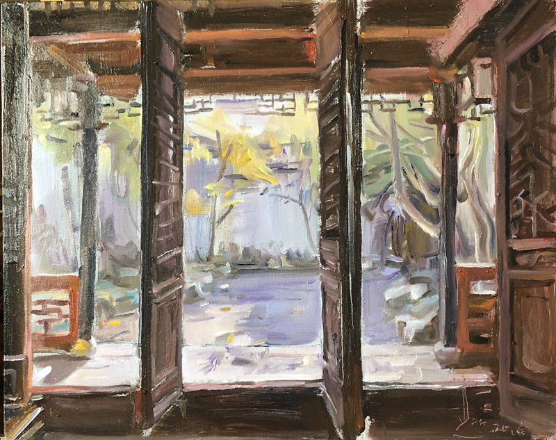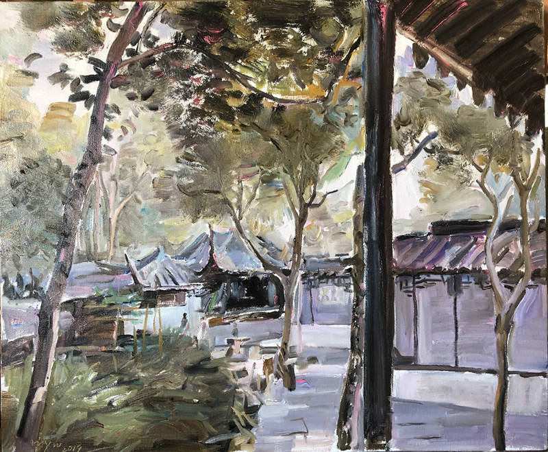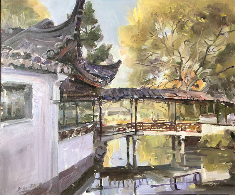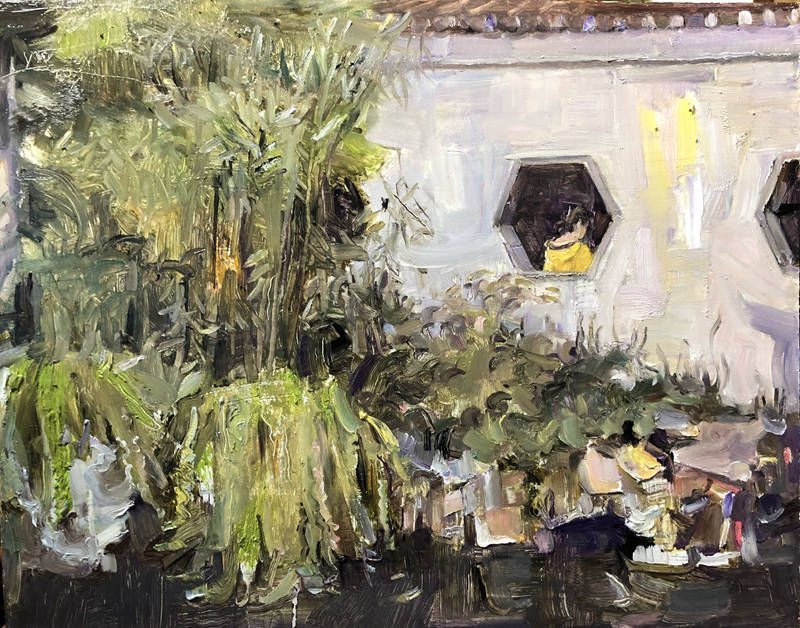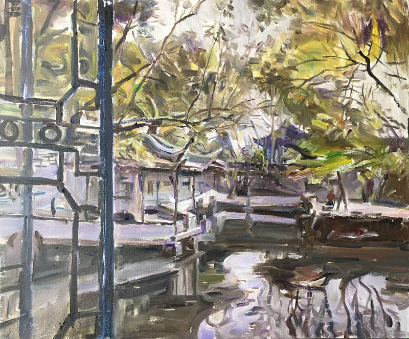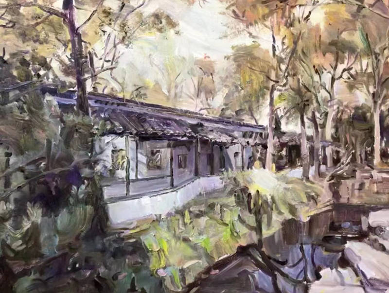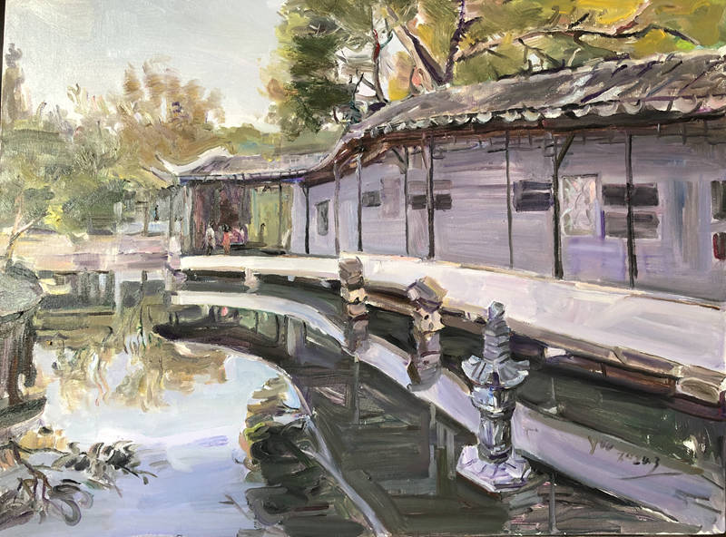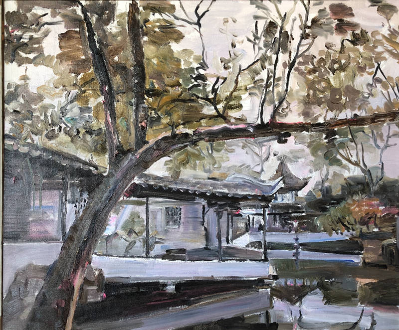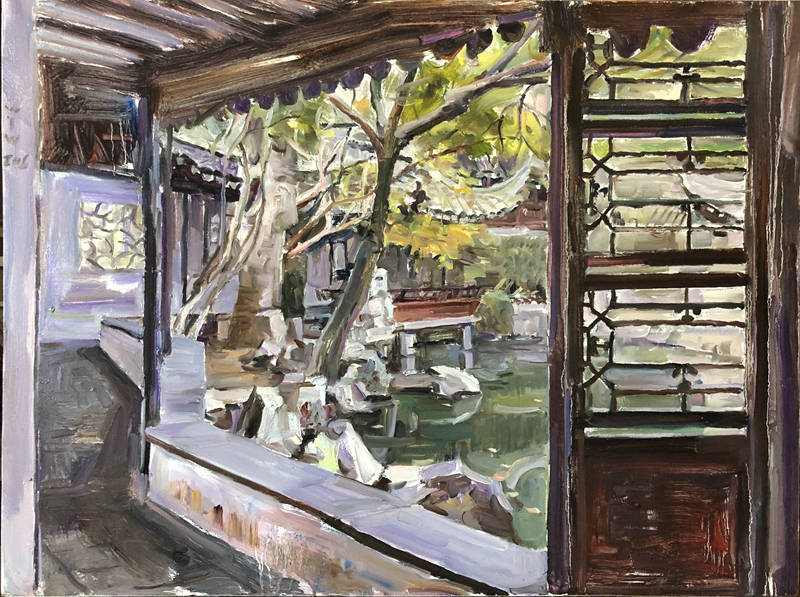 近日又見到他的園林風景,成系列,數量不少,頗有感於心。老耀的“園林”隨意,平和,取景構圖,彷彿有線相隨,彷彿一幀一幀的,隨步而定。讀起來是畫,連起來又是個園子的面貌,是個景,內中卻藏有他的用心經營之處。