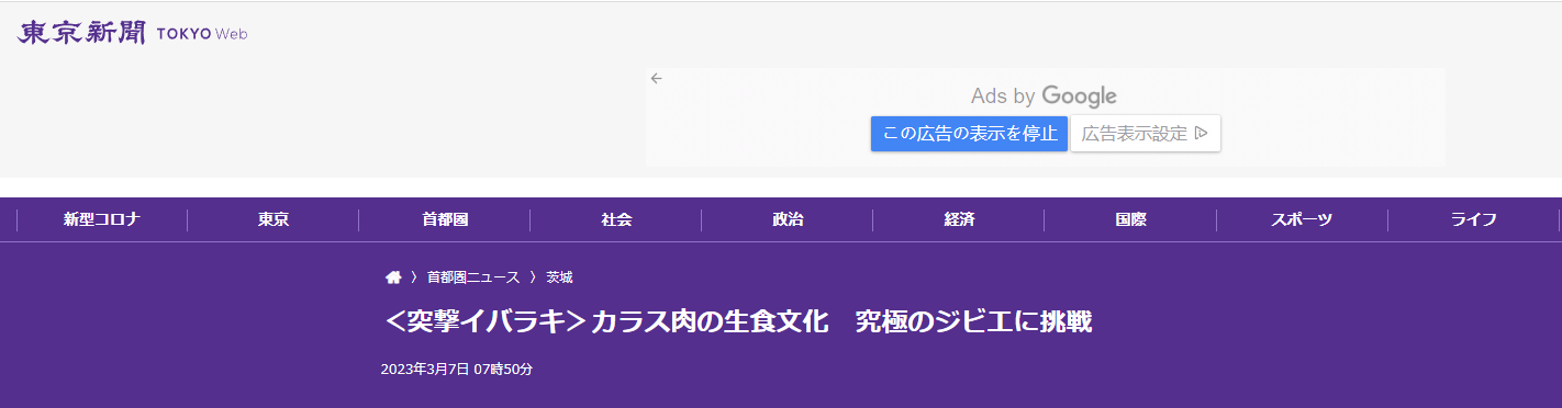 這件事情的起因,是日本東京新聞網上的一篇專欄文章,標題叫《烏鴉肉的生食文化——挑戰野味的極限》,根據這篇文章作者的描述,他是在某次取材的途中被一個店老闆邀請去品嚐這道所謂的烏鴉刺身的。
