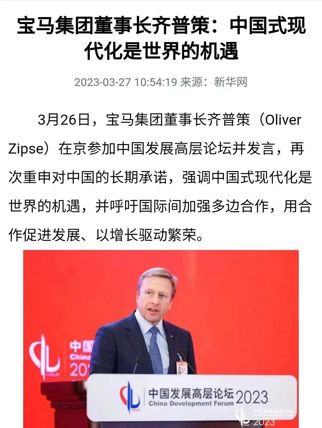 3月26日的消息:寶馬集團董事長齊普策,在北京參加中國發展高層論壇併發言時表示:“合作創造繁榮,脱鈎兩敗俱傷”,他反對和中國脱鈎。