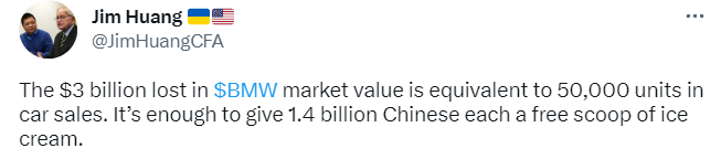 “寶馬市值損失的30億美元的價值,等同於其5萬台汽車銷量。這足以讓14億中國人每人免費獲得一勺冰淇淋了。”