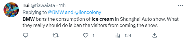 “寶馬禁止在上海車展上消費冰淇淋。他們真正應該做的是禁止觀眾來看演出。”