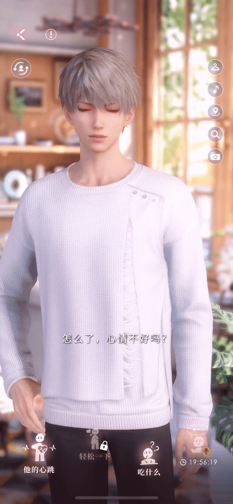 每個男主角的個人線中都有約會章節和日常玩法,這也是戀愛體驗最突出的部分。玩家站在男主角旁邊,看着他一臉嚴肅地抓娃娃;在餐廳偶遇的時候,玩家可以和男主角面對面地坐下來吃飯。還有喂水果、牽着手散步這種更加親密的互動。通過視角晃動和對屏幕的點擊,有時候還有相應的手勢操作,這類互動和人物之間的對話與動作是無縫銜接的,完全擺脱了對話框之類的限制。