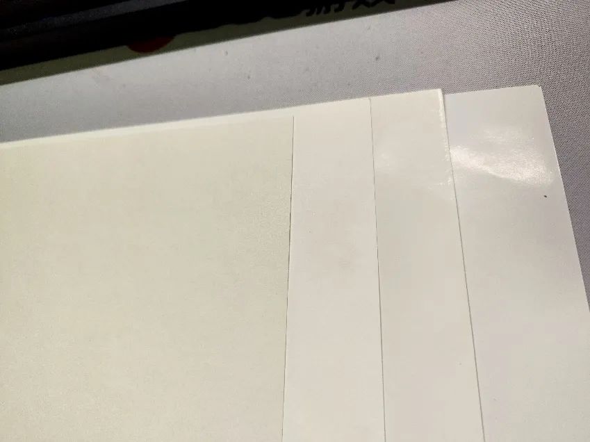 不同紙型的對比,從左到右依次為:輕型紙、純質紙、白卡紙和銅版紙,其中銅版紙反光嚴重。圖片來源:何況